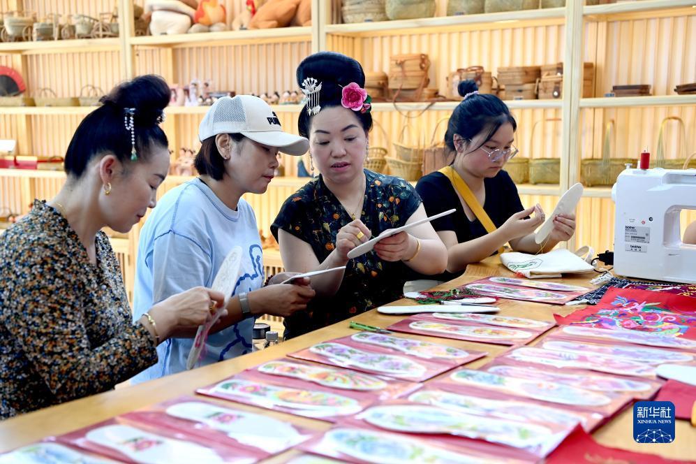 在陜西省漢中市包養網留壩縣老街內的一家手工店包養網展里,本地婦聯約請來自鎮包養網心得巴縣的苗繡教員(右二)為本地婦女及游客傳授苗繡(7月25日攝)。